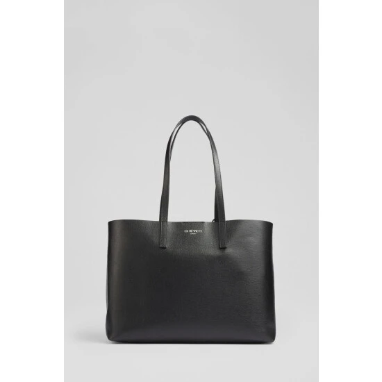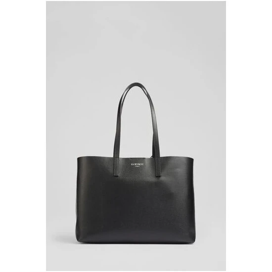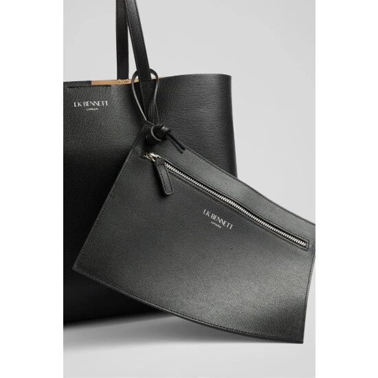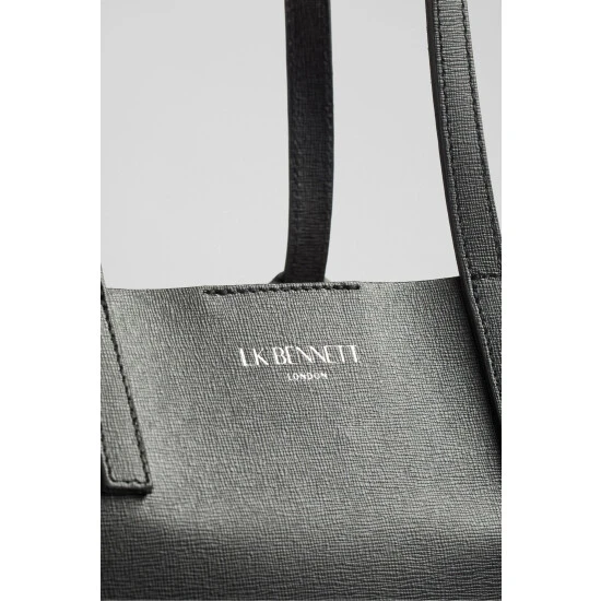 The Adele tote is crafted in Italy from recycled saffiano leather in black. It’s a large open tote with double handles, and a popper fastening and is unlined with a matching zip-across pouch on a removable strap inside.