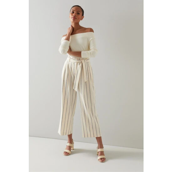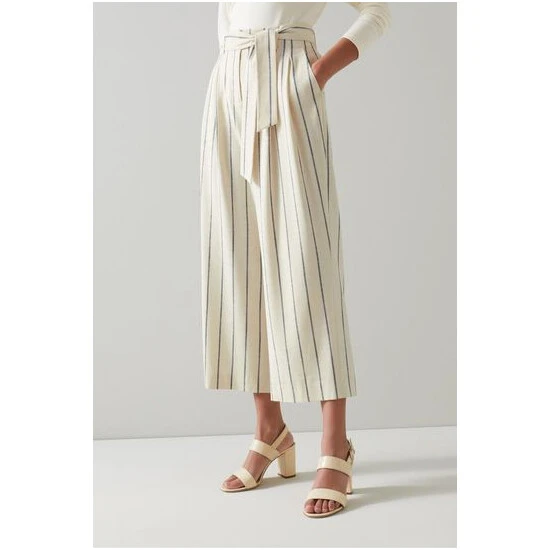 The Almeida trousers are crafted from a lightweight fabric in cream with blue wide pinstripes. They sit on the waist with belt loops and a tie belt, they have side pockets, pleat detail to the front and fall to a wide cut and a cropped length.