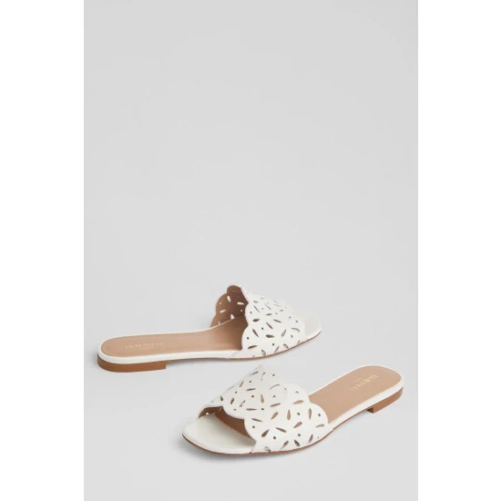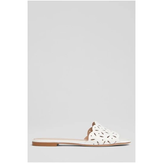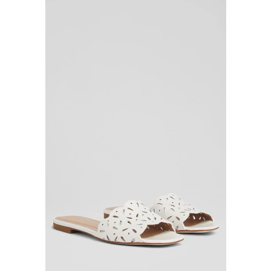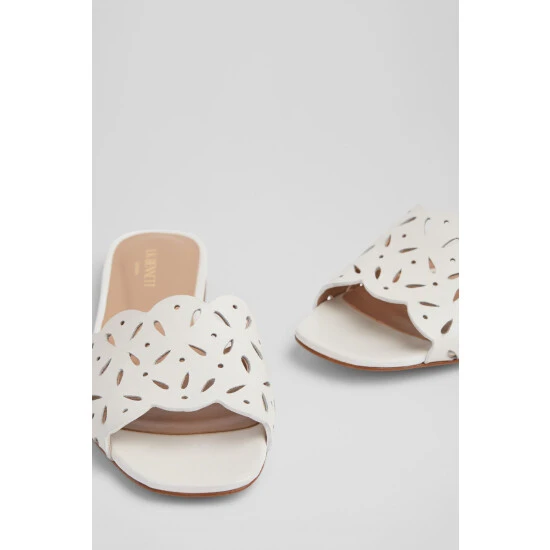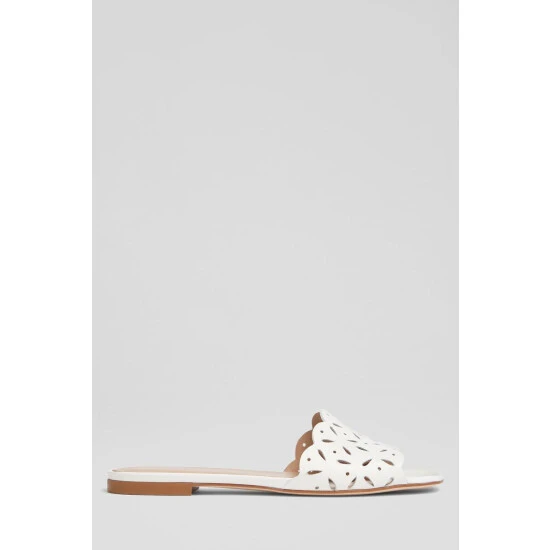 The Amaya mules are crafted in Spain from smooth calf leather in white. They have a single wide strap over the foot embellished with a perforated pattern and a flat heel.