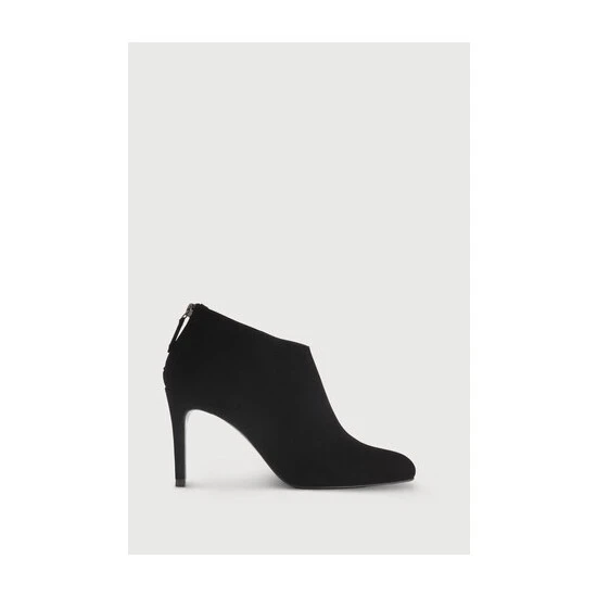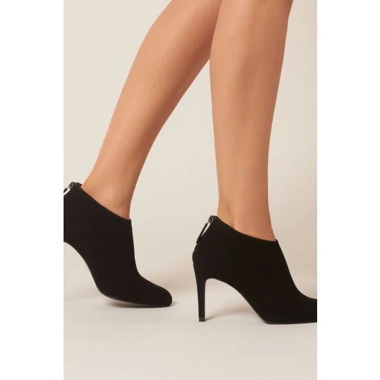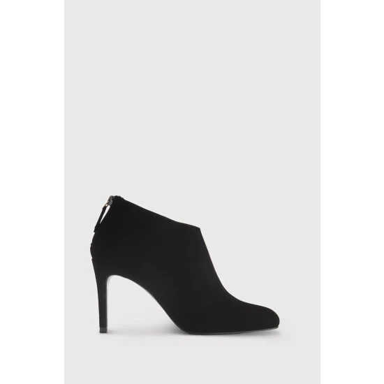 The Emily boots are a short, bootie design crafted from black suede. They have an almond-shaped toe, a stiletto heel and a flexible, comfortable sole.