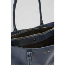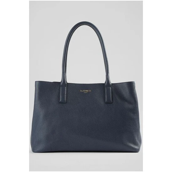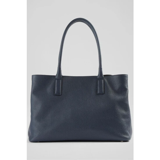The Lillian tote bag is crafted in Italy from grainy leather in navy blue. It has three compartments – one of which zips up – that fit A4 papers and files, and has two large top handles.