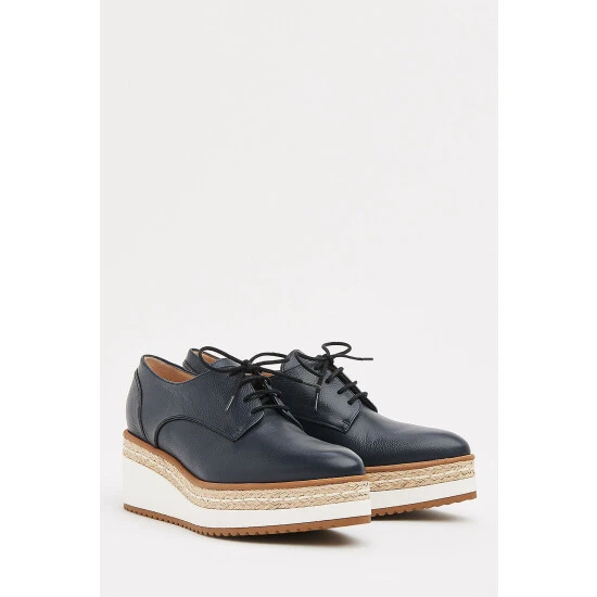 Crafted in Spain from soft grain calf leather in navy blue, they have navy laces, seam stitch lines and an espadrille trim to the contrast white platform sole.