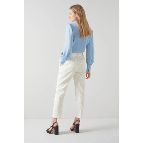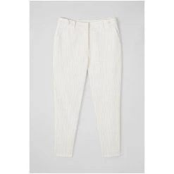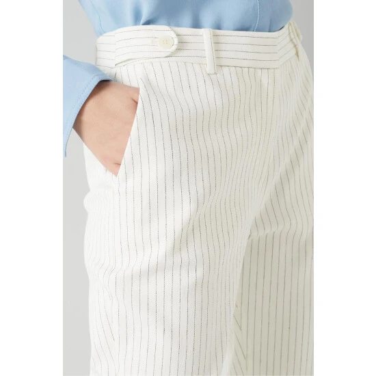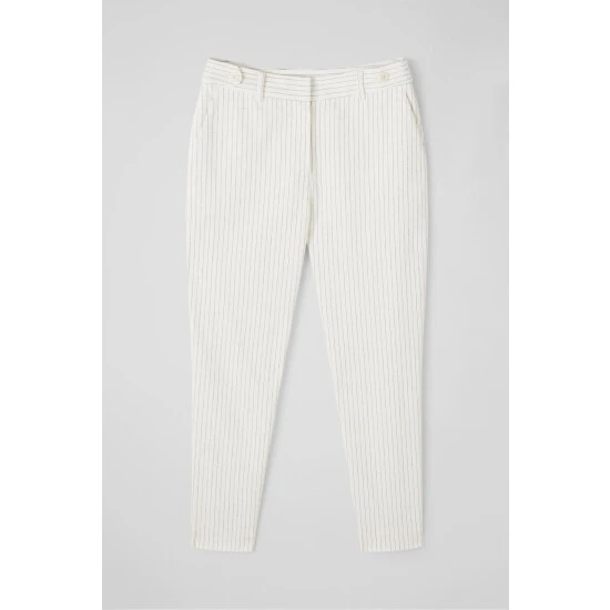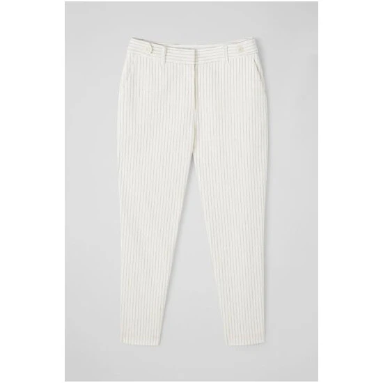 The Bree tailored trousers are crafted in Portugal from white pinstripe stretch cotton. They sit on the waist with belt loops and button-tab detail, have side pockets, a straight cut with pressed centre creases and are cropped at the ankle.