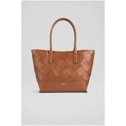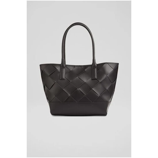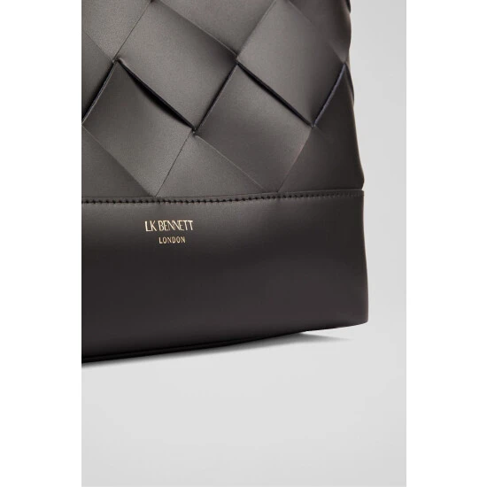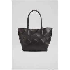 The Harper tote bag is crafted in Italy from smooth black leather in a woven design. It’s a roomy style with double handles and an inside pocket.