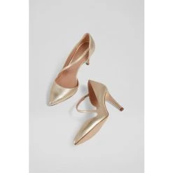 The Heather D’orsay courts are crafted in Spain from champagne-hued gold leather. They have a pointed toe, asymmetric cut-out-detail across the foot and a slender, 85mm stiletto heel.