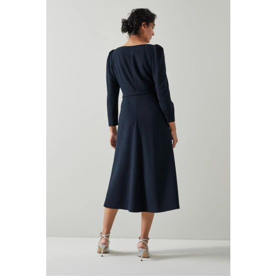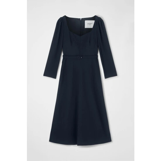 The Katerina dress is crafted from navy blue crepe. It has a sweetheart neckline, puff shoulders, bracelet-length sleeves, a nipped waist with a buckle belt and a midi skirt.
