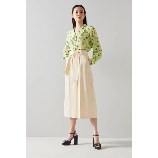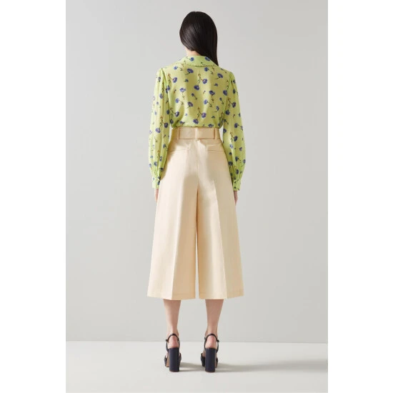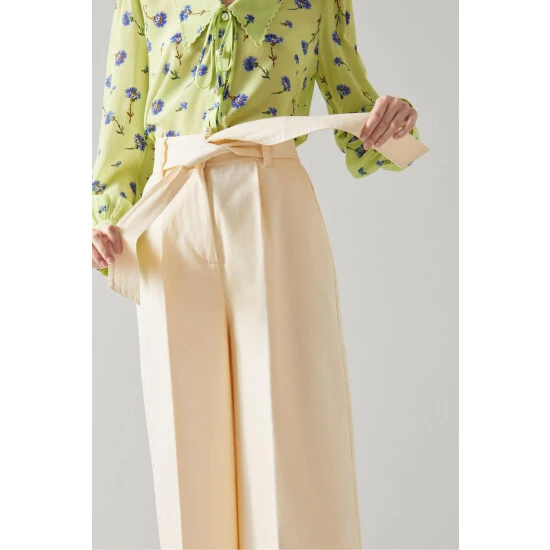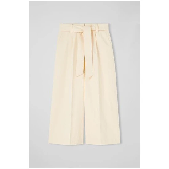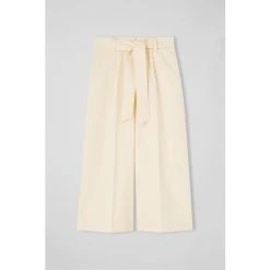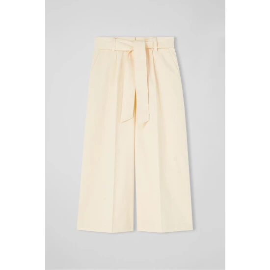 The Lena trousers are crafted from cream cotton. They sit on the waist with a tie belt, have side pockets, back welt pockets, a wide cut with pressed centre creases and a cropped ankle length.
