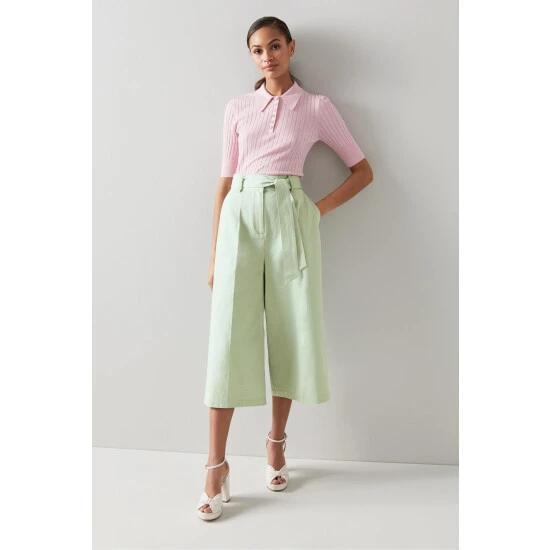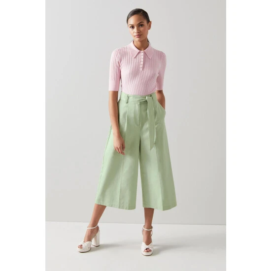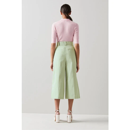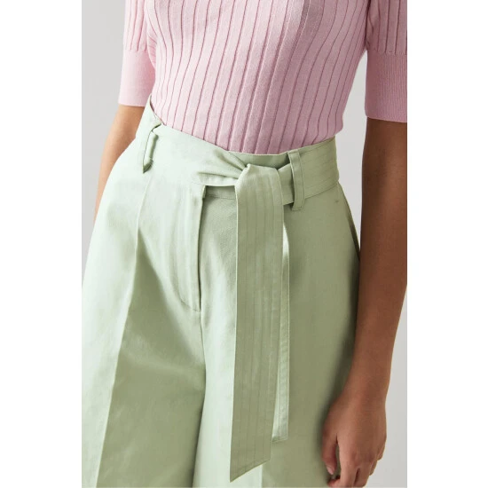 The Lena trousers are crafted from a soft cotton in mint green. They sit on the waist with a tie belt, have side pockets, back welt pockets, a wide cut with pressed centre creases and a cropped ankle length.