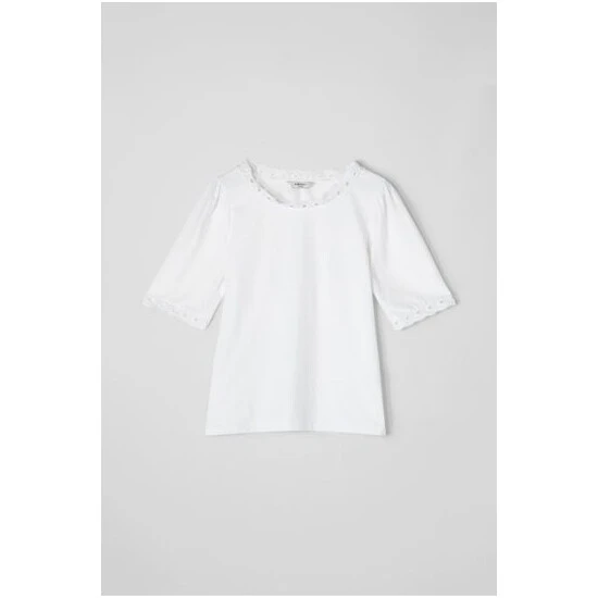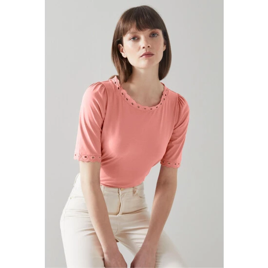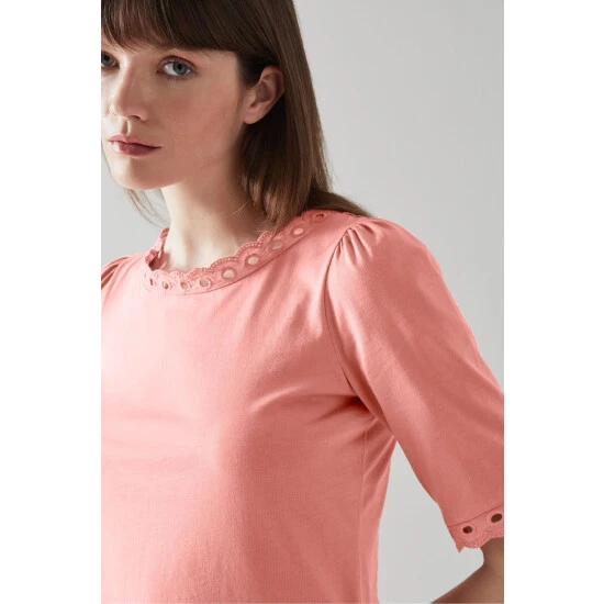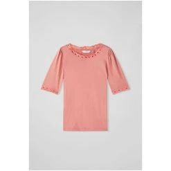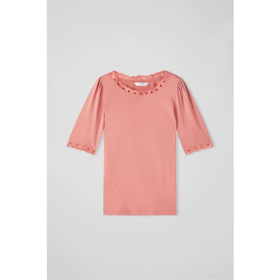 The Lilly T-shirt is crafted in Portugal from rose pink jersey. It has a round neck trimmed with broderie anglaise, short sleeves with puff shoulders and a matching trim, and a classic, regular cut.