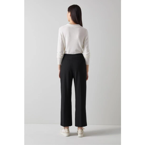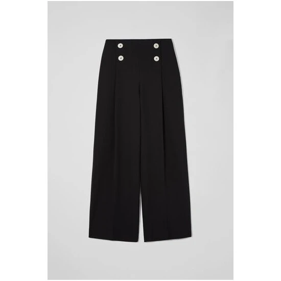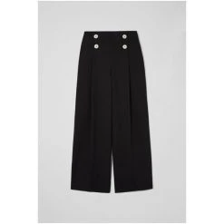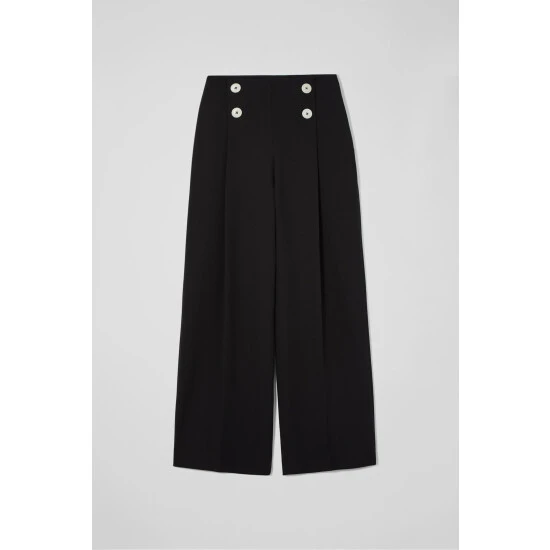 The Parker trousers are crafted from a lightweight black fabric. They sit high on the waist, have with four white buttons across the front, a side zip, centre creases and a wide-cut, cropped shape.