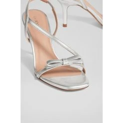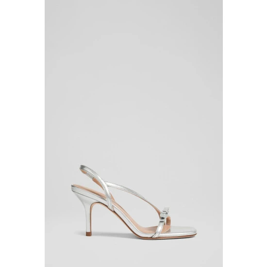 The Serene sandals are crafted in Spain from a silver-blue mirror metallic synthetic leather. They have a strap over the toes embellished with a small bow, an asymmetric strap across the front, an elasticated slingback strap and an 80mm stiletto heel.