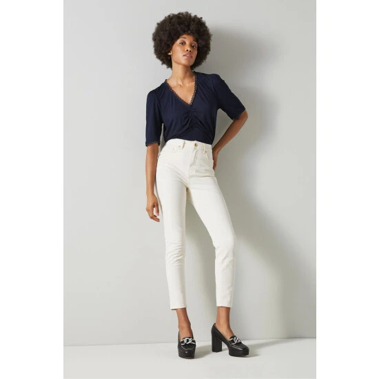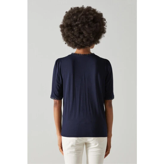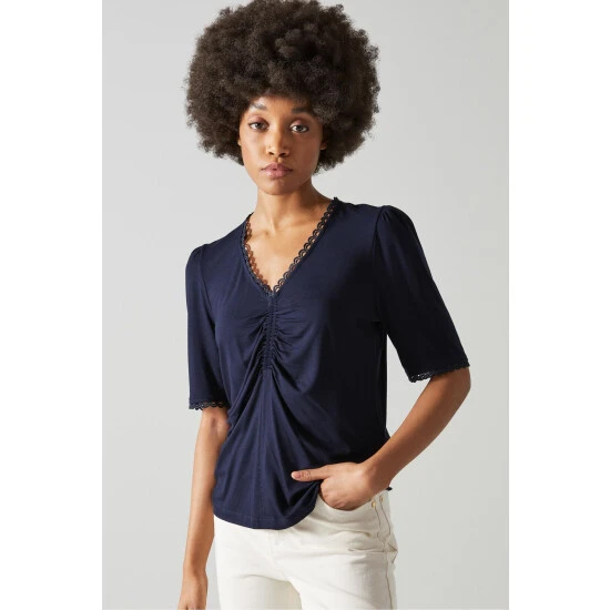 The Sylvie T-shirt is crafted in Portugal from jersey in navy blue. It has a V-neck with ruching detail and picot trim, puff shoulders, short sleeves with a matching trim and a regular fit