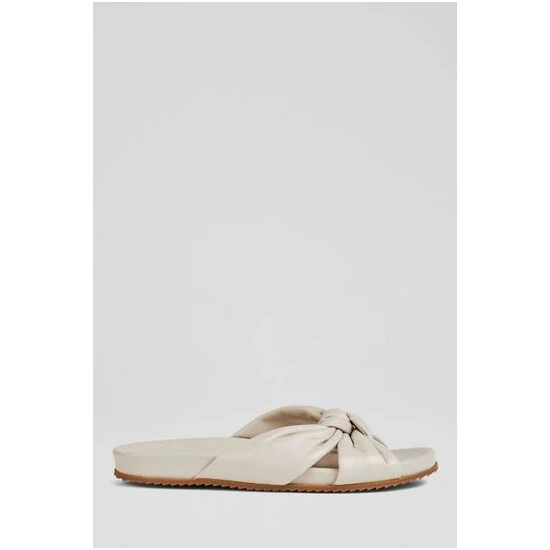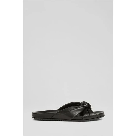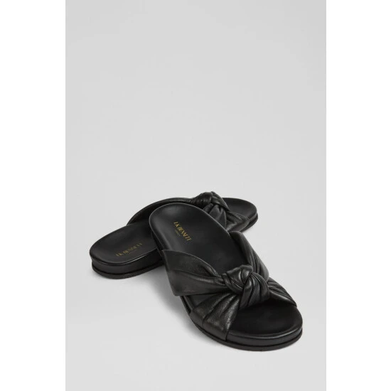 The Valerie sliders are crafted in Spain from nappa leather. They knot over the front of the foot, have a comfortable, shaped footbed and a textured rubber sole.